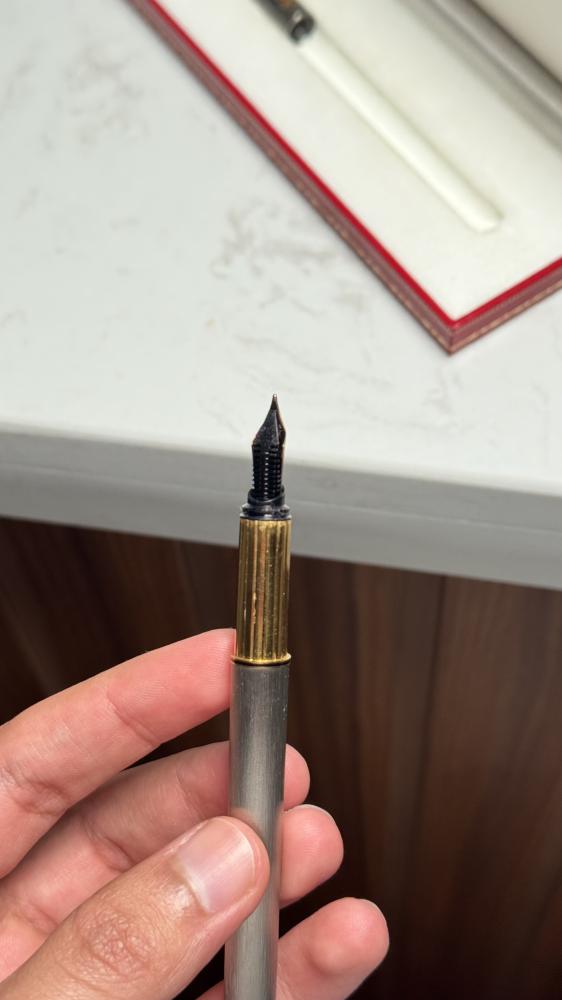 قلم كارتير اصلي ڤنتج اللون : سلفر بذهبي العلبه : اصليه ريشه الحاله :نظيف جداً نسبة النظافه :( 90٪) ملاحظه ( يحتاج إلى حبر )